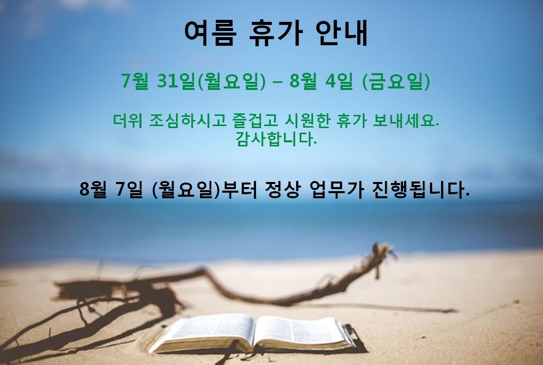 공지여름휴가 공지 / 7월 31일(월요일) ~8월 4일 (금요일) 등록일 : 2017.07.26조회수 : 6793 이전글 2017 POWER-GEN EUROPE 참가 2017.07.11 다음글 추석휴가 / 10월 2일(월요일) ~10월 9일 (월요일) 2017.09.26 목록보기