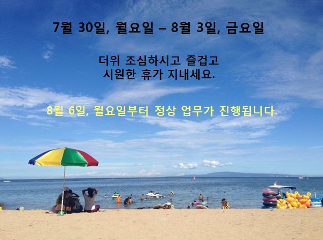 공지여름휴가 공지 / 7월 30일(월요일) ~8월 3일 (금요일) 등록일 : 2018.07.17조회수 : 6780 이전글 [언론/보도] NICE평가정보 면진ㆍ제진 분야 최우수 인증 2018.05.25 다음글 추석휴가 / 9월 22일(토요일) ~9월 26일 (수요일) 2018.09.12 목록보기