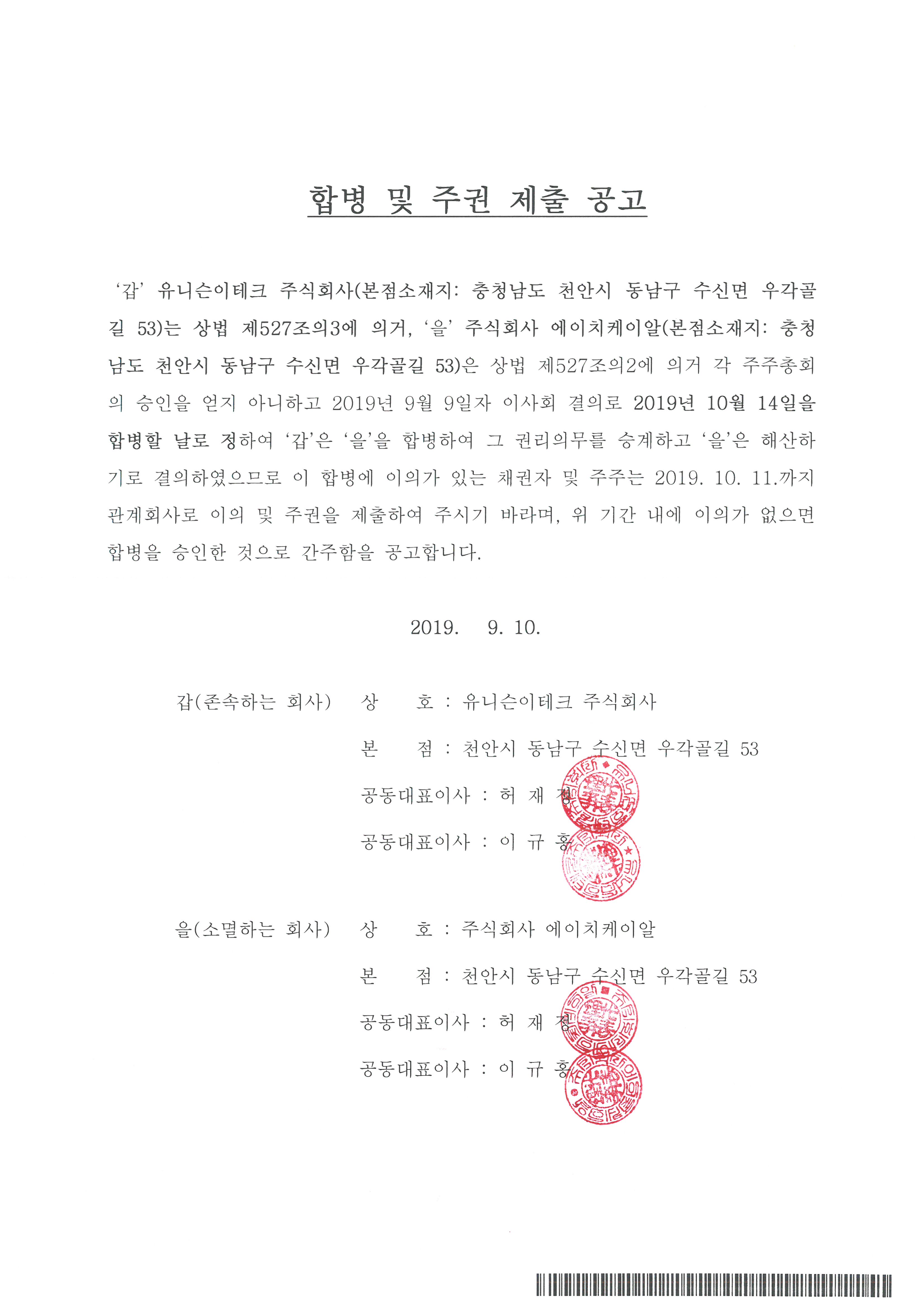 공지합병 및 주권 제출 공고 - (주)에이치케이알 등록일 : 2019.09.10조회수 : 6377 이전글 합병공고 - 유니슨이테크(주) 2019.09.10 다음글 합병보고 공고 2019.10.14 목록보기